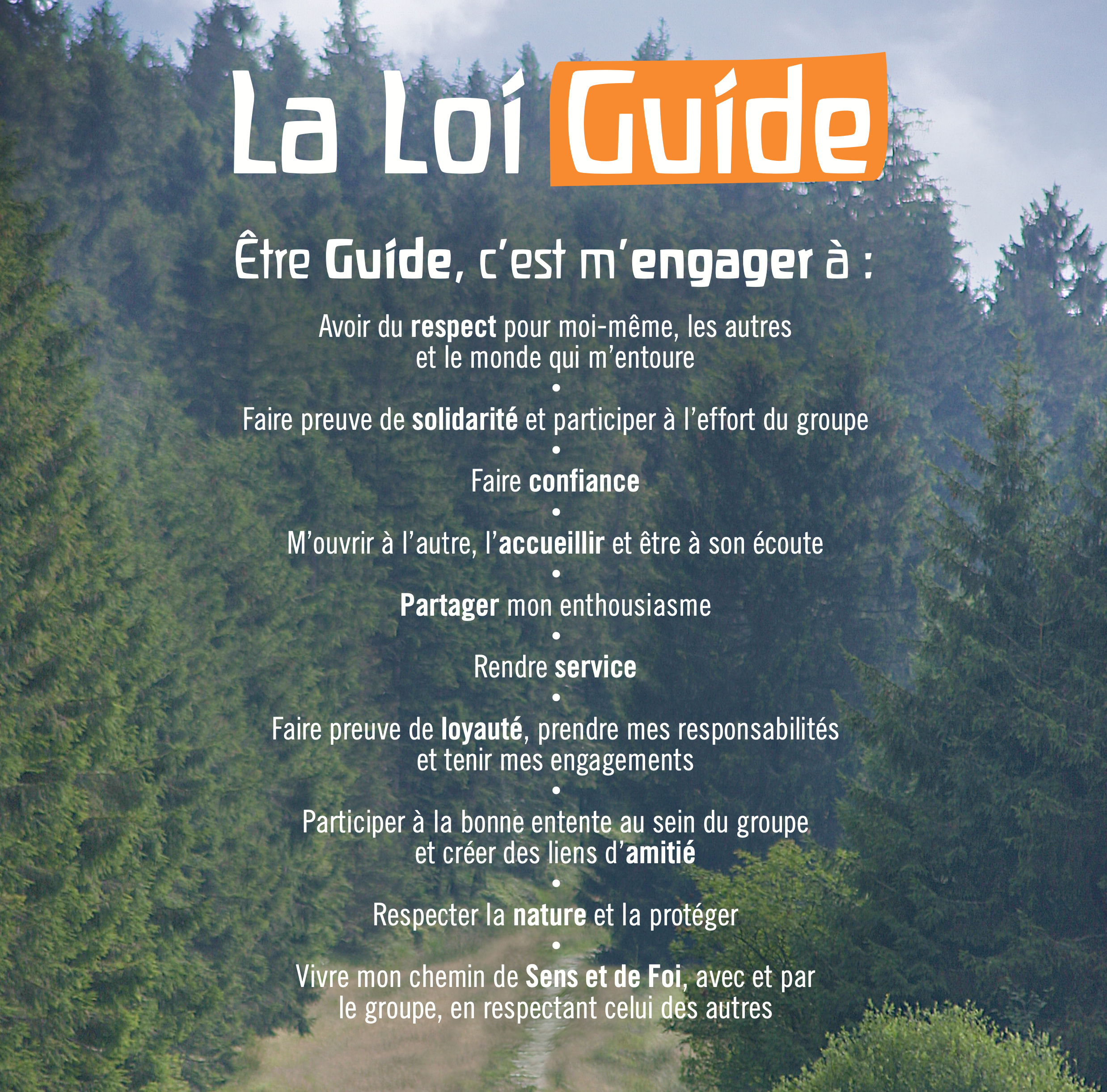 Au travers de l’animation, de la Loi Guide et de toute activité de recherche de Sens et de Foi, le Guidisme éduquent également aux valeurs suivantes : amitié, simplicité, honnêteté, loyauté, créativité, coopération, plaisir, volontariat, optimisme, autonomie, écoute, solidarité, égalité et générosité.
